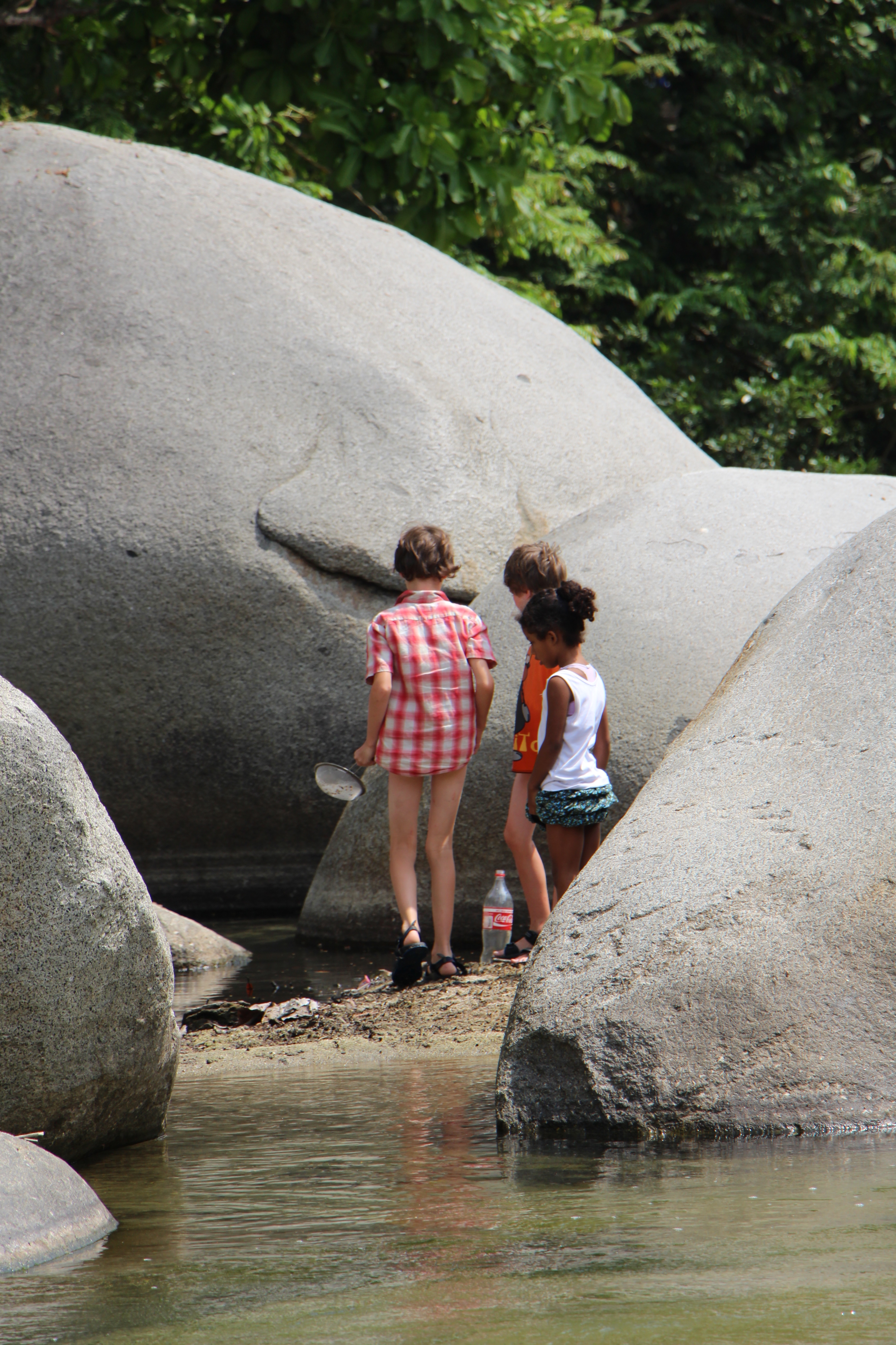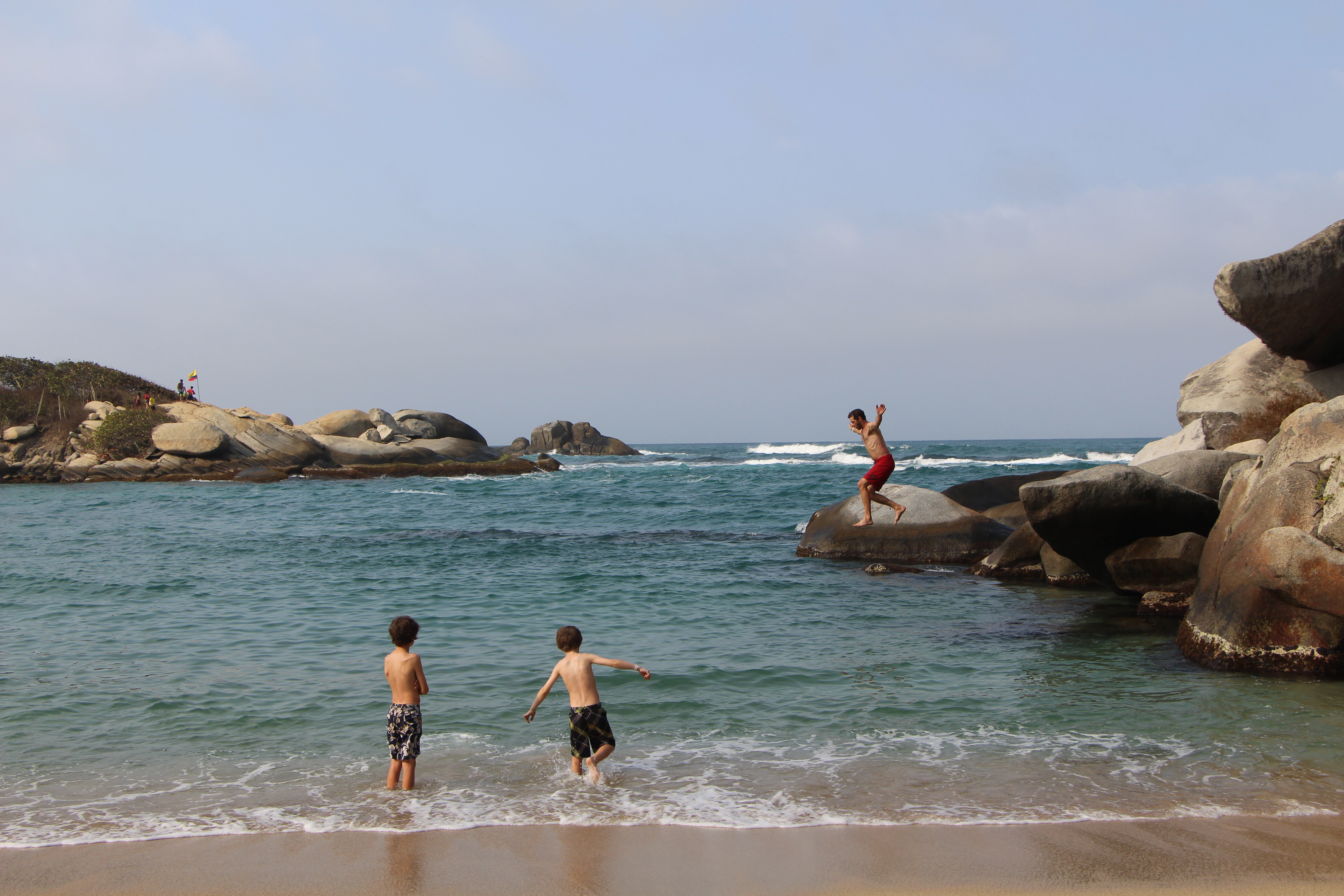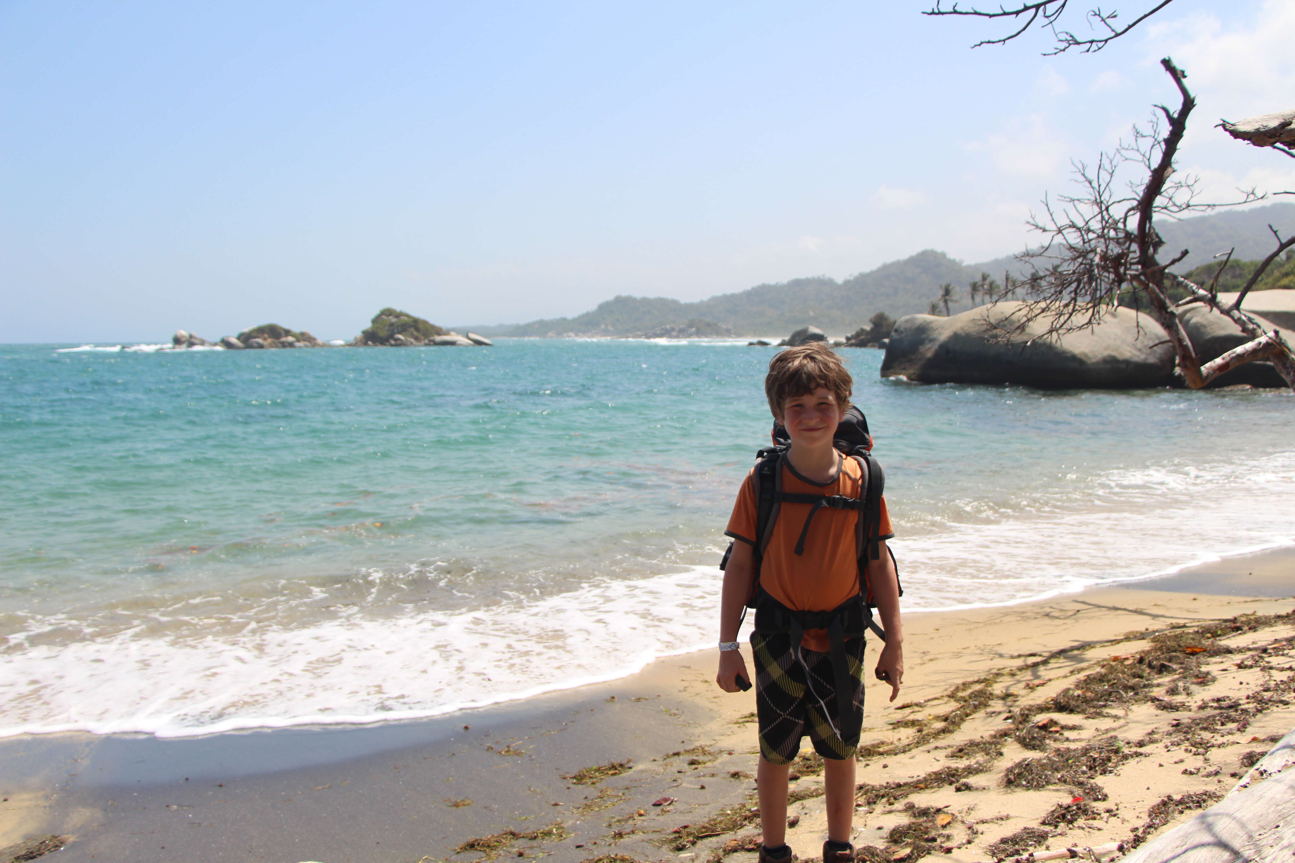 We left Taganga and headed toward Parque Nacional Tayrona. We stopped by a beautiful river on the way to filter water, it was a refreshing swim and the kids played with a beautiful 5 year old girl who lived nearby. The kids stripped down and with our strainer, caught fish and other critters and carried them around in a coke bottle they found by the river. The filtered water was a great idea, but after sitting in our nalgene bottles for a while, it began smelling a bit un-wordly. If I had to pick one thing I’m definitely OCD about, it’s my water. Let’s just say that I’m learning to adapt.