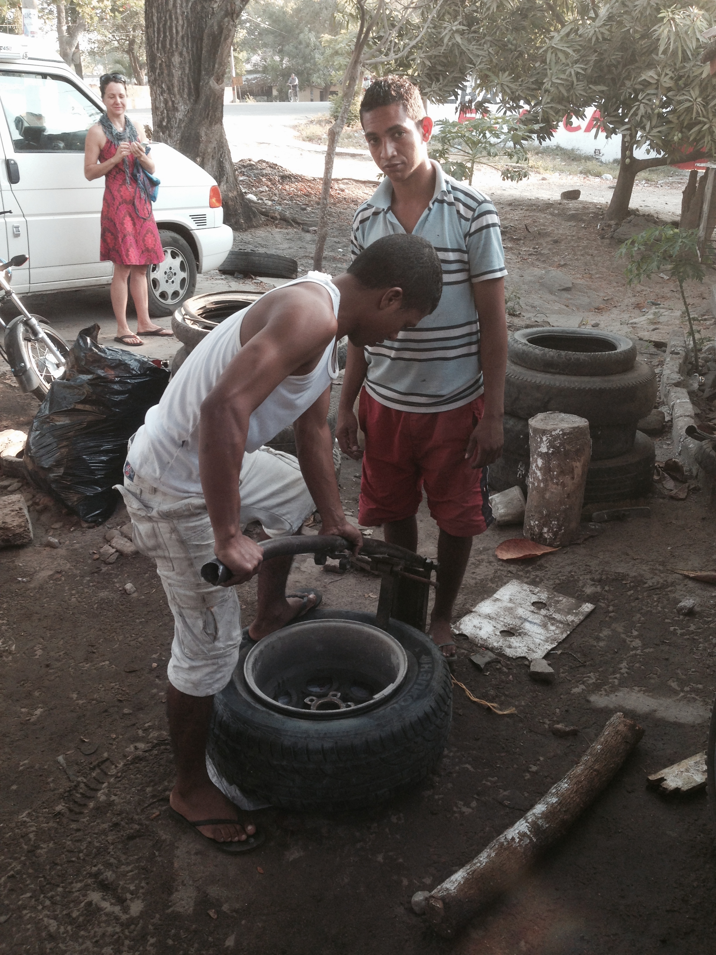 Before I was able to get out of the van, many Colombians on motorcycles, rickshaws and on foot were surrounding the van, eager to help. It took 3 minutes to shuffle the gear of 5 people living in the van in order to get to the tools stored in the back. Within 5 minutes, my new comrades and I were installing the spare tire. In all the preparations, I’d never inspected the spare tire to be sure it was inflated. Although low in air pressure, the full size spare tire was good to go. I was particular about installing the lug nuts myself to prevent stripping of the threads. As I was installing the tire, my Colombian friends were stripping the threads holding the spare tire under the van.